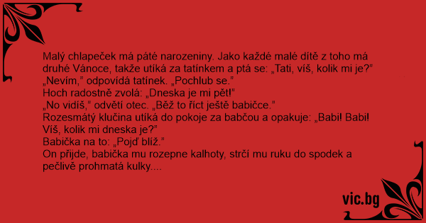 On přijde, babička mu rozepne kalhoty, strčí mu ruku do spodek a pečlivě prohmatá kulky. Potom praví: „Je ti pět.”