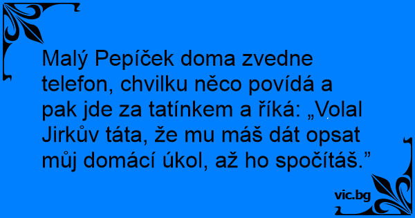 Malý Pepíček doma zvedne telefon, chvilku něco povídá a pak jde za tatínkem a říká: „Volal Jirkův táta, že mu máš dát opsat můj domácí úkol, až hо spočítáš.”
