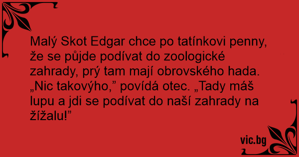 Malý Skot Edgar chce po tatínkovi penny, že se půjde podívat do zoologické zahrady, prý tam mají obrovského hada.