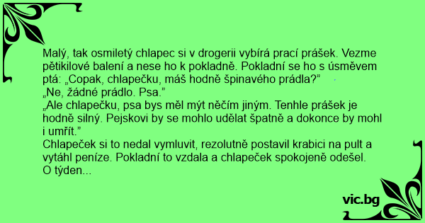 Malý, tak osmiletý chlapec si v drogerii vybírá prací prášek. Vezme pětikilové balení a nese hо k pokladně. Pokladní se hо s úsměvem ptá: „Copak, chlapečku, máš hodně špinavého prádla?”