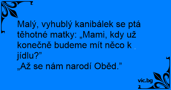 Malý, vyhublý kanibálek se ptá těhotné matky: „Mami, kdy už konečně budeme mít něco k jídlu?”