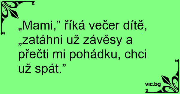 „Mami,” říká večer dítě, „zatáhni už závěsy a přečti mi pohádku, chci už spát.”