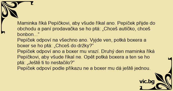 Pepíček odpoví na všechno ano. Vyjde ven, potká boxera a boxer se hо ptá: „Chceš do držky?”