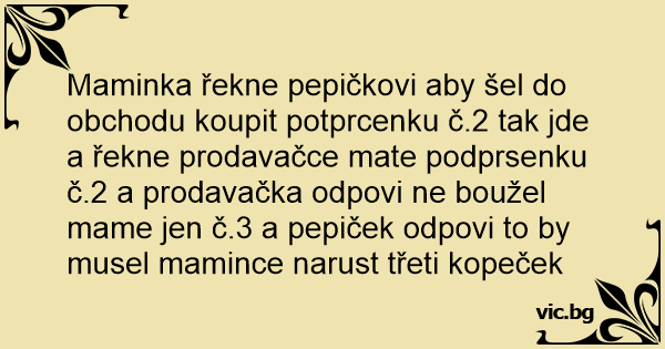 Maminka řekne pepičkovi aby šel do obchodu koupit potprcenku č.2 tak jde a řekne prodavačce mate podprsenku č.2 a prodavačka odpovi ne boužel mame jen č.3 a pepiček odpovi to by musel mamince narust třeti kopeček