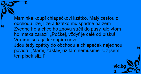 Jdou tedy zpátky do obchodu a chlapeček najednou povídá: „Mami, zastav, už tam nemusíme. Už jsem ten písek slízl!”