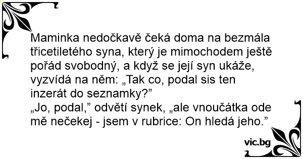 „Jo, podal,” odvětí synek, „ale vnoučátka ode mě nečekej - jsem v rubrice: On hledá jeho.”