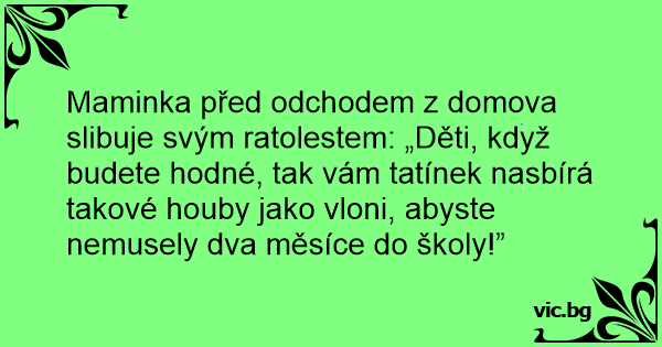 Maminka před odchodem z domova slibuje svým ratolestem: „Děti, když budete hodné, tak vám tatínek nasbírá takové houby jako vloni, abyste nemusely dva měsíce do školy!”