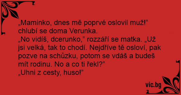 „No vidíš, dcerunko,” rozzáří se matka. „Už jsi velká, tak to chodí. Nejdříve tě osloví, pak pozve na schůzku, potom se vdáš a budeš mít rodinu. No a co ti řekl?”
