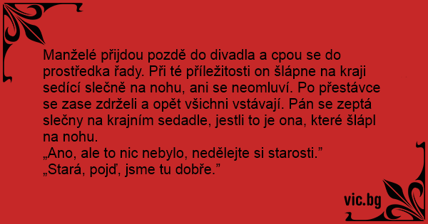 Manželé přijdou pozdě do divadla a cpou se do prostředka řady. Při té příležitosti on šlápne na kraji sedící slečně na nohu, ani se neomluví. Po přestávce se zase zdrželi a opět všichni vstávají. Pán se zeptá slečny na krajním sedadle, jestli to je ona, které šlápl na nohu.