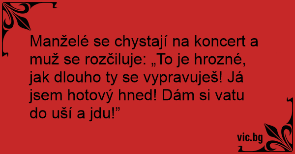 Manželé se chystají na koncert a muž se rozčiluje: „To je hrozné, jak dlouho ty se vypravuješ! Já jsem hotový hned! Dám si vatu do uší a jdu!”