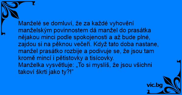 Manželé se domluví, že za každé vyhovění manželským povinnostem dá manžel do prasátka nějakou minci podle spokojenosti a až bude plné, zajdou si na pěknou večeři. Když tato doba nastane, manžel prasátko rozbije a podivuje se, že jsou tam kromě mincí i pětistovky a tisícovky.