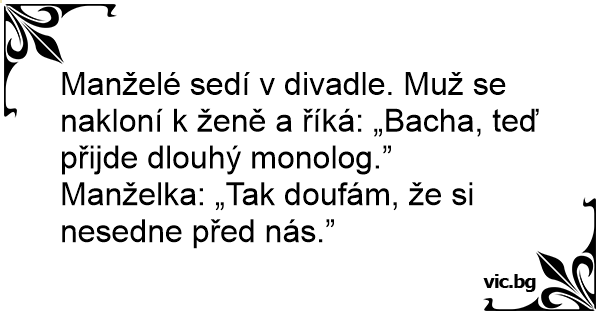 Manželé sedí v divadle. Muž se nakloní k ženě a říká: „Bacha, teď přijde dlouhý monolog.”
