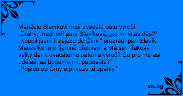 Manželku to příjemně překvapí a ptá se: „Takový velký dar k dvacátému pátému výročí! Co pro mě asi uděláš, až budeme mít padesáté?”