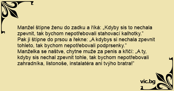 Manželka se naštve, chytne muže za реnis a křičí: „A ty, kdyby sis nechal zpevnit tohle, tak bychom nepotřebovali zahradníka, listonoše, instalatéra ani tvýho bratra!”