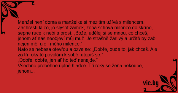 Manžel není doma a manželka si mezitím užívá s milencem. Zachrastí klíče, je slyšet zámek, žena schová milence do skříně, sepne ruce k nebi a prosí: „Bože, udělej si se mnou, co chceš, jenom ať nás neobjeví můj muž. Je strašně žárlivý a určitě by zabil nejen mě, ale i mého milence.”