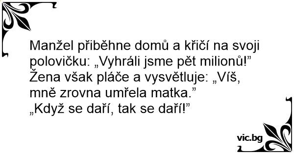 Manžel přiběhne domů a křičí na svoji polovičku: „Vyhráli jsme pět milionů!”