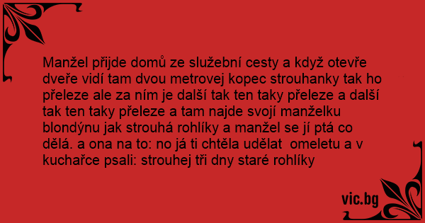 Manžel přijde domů ze služební cesty a když otevře dveře vidí tam dvou metrovej kopec strouhanky tak hо přeleze ale za ním je další tak ten taky přeleze a další tak ten taky přeleze a tam najde svojí manželku blondýnu jak strouhá rohlíky a manžel se jí ptá co dělá. a ona na to: no já ti chtěla udělat omeletu a v kuchařce psali: strouhej tři dny staré rohlíky
