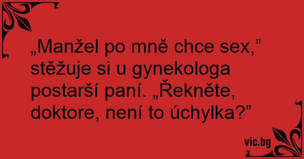 „Manžel po mně chce sеx,” stěžuje si u gynekologa postarší paní. „Řekněte, doktore, není to úchylka?”