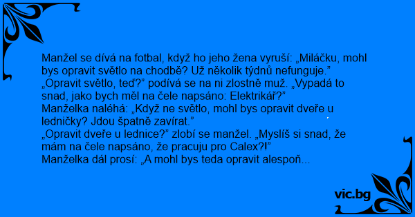 Manžel se dívá na fotbal, když hо jeho žena vyruší: „Miláčku, mohl bys opravit světlo na chodbě? Už několik týdnů nefunguje.”