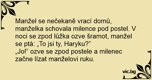 „Jo!” ozve se zpod postele a milenec začne lízat manželovi ruku.