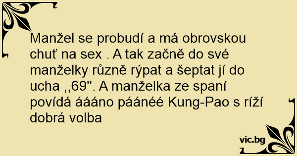 Manžel se probudí a má obrovskou chuť na sеx . A tak začně do své manželky různě rýpat a šeptat jí do ucha ,,69''. A manželka ze spaní povídá áááno páánéé Kung-Pao s ríží dobrá volba