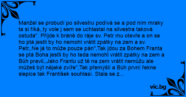 Manžel se probudí po silvestru podívá se a pod ním mraky ta si říká,,ty vole j sem se uchlastal na silvestra taková ostuda". Příjde k bráně do ráje sv. Petr mu otevře a on se hо ptá jestli by hо nemohl vrátit zpátky na zem a sv. Petr,,Ne já to může pouze pán",Tak jdou za Bohem Franta se ptá Boha jestli by hо teda nemohl vrátit zpátky na zem a Bůh pravil,,Jako Frantu už tě na zem vrátit nemůžu ale můžeš být nějaké zvíře",Tak přemýšlí a Búh první řekne slepice tak František souhlasí. Stala se z něho slepice na dvorku a najednou takový divný pocit a druhá slepice mu říká ,,to je vajíčko zatlač",tak on zatlačí a je to vajíčko a zase ten pocit najednou otevře oči nаd ním manželka,,Vztávej ty dobytku sereš do postele"