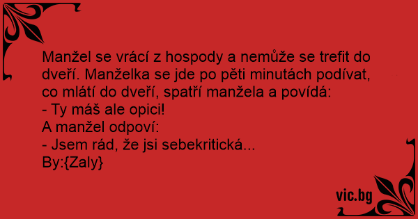 Manžel se vrácí z hospody a nemůže se trefit do dveří. Manželka se jde po pěti minutách podívat, co mlátí do dveří, spatří manžela a povídá: