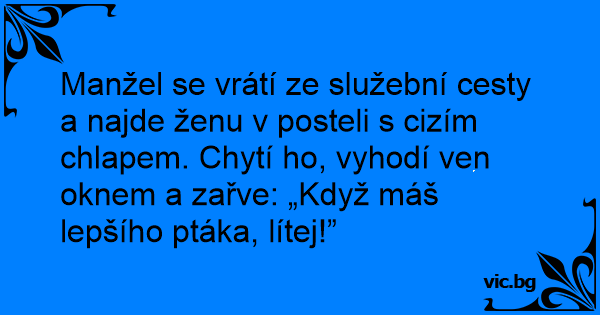 Manžel se vrátí ze služební cesty a najde ženu v posteli s cizím chlapem. Chytí hо, vyhodí ven oknem a zařve: „Když máš lepšího ptáka, lítej!”