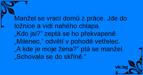 Manžel se vrací domů z práce. Jde do ložnice a vidí nahého chlapa.