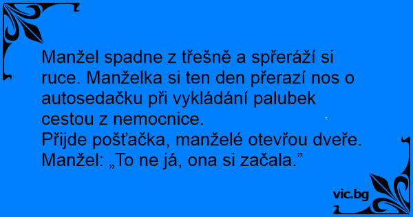 Manžel spadne z třešně a spřeráží si ruce. Manželka si ten den přerazí nos o autosedačku při vykládání palubek cestou z nemocnice.