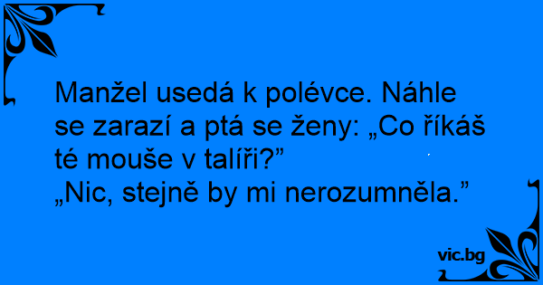 Manžel usedá k polévce. Náhle se zarazí a ptá se ženy: „Co říkáš té mouše v talíři?”