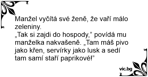 „Tak si zajdi do hospody,” povídá mu manželka nakvašeně. „Tam máš pivo jako křen, servírky jako lusk a sedí tam samí staří paprikové!”