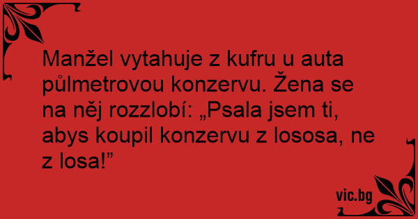 Manžel vytahuje z kufru u auta půlmetrovou konzervu. Žena se na něj rozzlobí: „Psala jsem ti, abys koupil konzervu z lososa, ne z losa!”