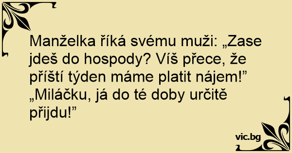 Manželka říká svému muži: „Zase jdeš do hospody? Víš přece, že příští týden máme platit nájem!”