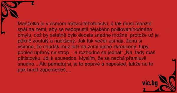 Manželka je v osmém měsíci těhotenství, a tak musí manžel spát na zemi, aby se nedopustil nějakého politováníhodného omylu, což by ostatně bylo docela snadno možné, protože už je pěkně zoufalý a nadržený. Jak tak večer usínají, žena si všimne, že chudák muž leží na zemi úplně zkroucený, tupý pohled upřený na strop... a rozhodne se jednat: „Na, tady máš pětistovku. Jdi k sousedce. Myslím, že se nechá přemluvit snadno... Ale pamatuj si, je to poprvé a naposled, takže na to pak hned zapomeneš, jasné?”