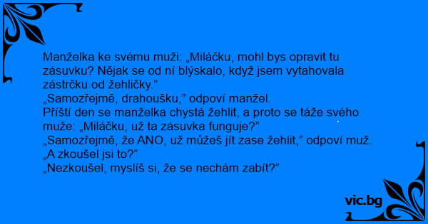 Manželka ke svému muži: „Miláčku, mohl bys opravit tu zásuvku? Nějak se od ní blýskalo, když jsem vytahovala zástrčku od žehličky.”