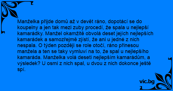 Manželka přijde domů až v devět ráno, dopotácí se do koupelny a jen tak mezi zuby procedí, že spala u nejlepší kamarádky. Manžel okamžitě obvolá deset jejích nejlepších kamarádek a samozřejmě zjístí, že ani u jedné z nich nespala. O týden později se role otočí, ráno přinesou manžela a ten se taky vymluví na to, že spal u nejlepšího kamaráda. Manželka volá deseti nejlepším kamarádům, a výsledek? U osmi z nich spal, u dvou z nich dokonce ještě spí.