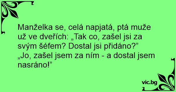 Manželka se, celá napjatá, ptá muže už ve dveřích: „Tak co, zašel jsi za svým šéfem? Dostal jsi přidáno?”