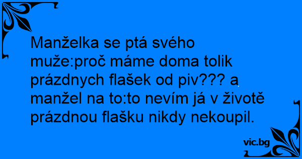 Manželka se ptá svého muže:proč máme doma tolik prázdnych flašek od piv??? a manžel na to:to nevím já v životě prázdnou flašku nikdy nekoupil.