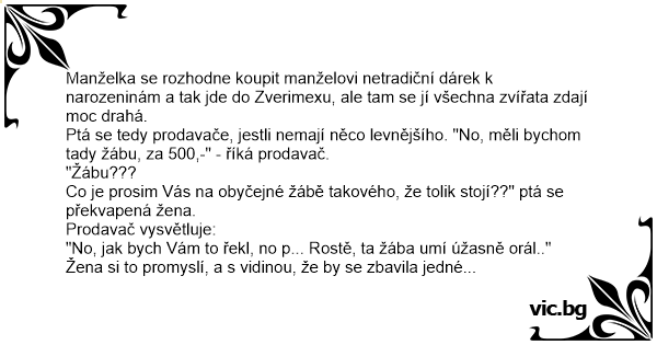 Ptá se tedy prodavače, jestli nemají něco levnějšího. "No, měli bychom tady žábu, za 500,-" - říká prodavač.