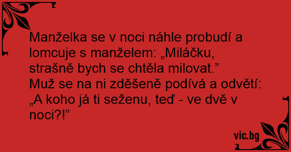 Manželka se v noci náhle probudí a lomcuje s manželem: „Miláčku, strašně bych se chtěla milovat.”