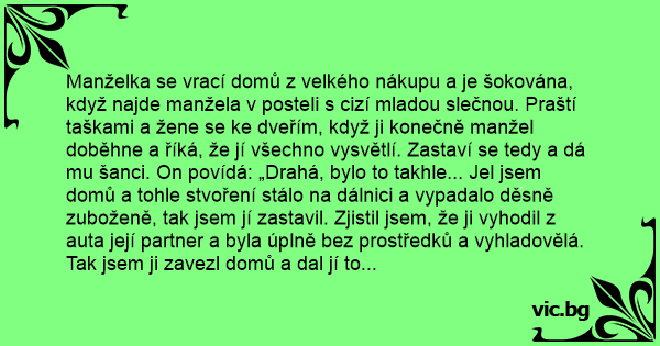 Manželka se vrací domů z velkého nákupu a je šokována, když najde manžela v posteli s cizí mladou slečnou. Praští taškami a žene se ke dveřím, když ji konečně manžel doběhne a říká, že jí všechno vysvětlí. Zastaví se tedy a dá mu šanci. On povídá: „Drahá, bylo to takhle... Jel jsem domů a tohle stvoření stálo na dálnici a vypadalo děsně zuboženě, tak jsem jí zastavil. Zjistil jsem, že ji vyhodil z auta její partner a byla úplně bez prostředků a vyhladovělá. Tak jsem ji zavezl domů a dal jí to vepřové, cos včera nedojedla k večeři. Měla prošlapané boty, tak jsem jí dal nějaké sportovní, které už nenosíš, protože nejsou v módě. Protože bylo venku zima, dal jsem jí ten svetr, cos dostala loni k narozeninám a nenosíš hо, protože ti prý nesluší. Pak jsem jí dal jedny tvoje tepláky, do kterých už se nevejdeš. No, a když už odcházela, tak se mě ještě zeptala: Je tady ještě něco, co vaše žena už nepoužívá? ... No a...”