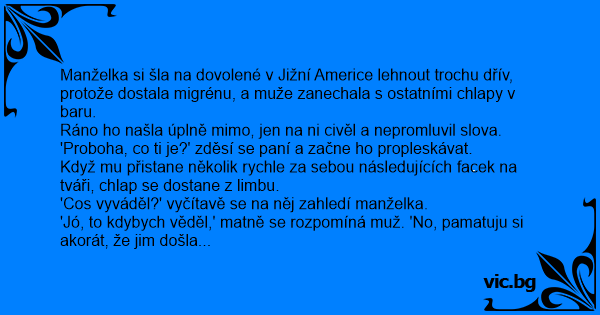 Manželka si šla na dovolené v Jižní Americe lehnout trochu dřív, protože dostala migrénu, a muže zanechala s ostatními chlapy v baru.