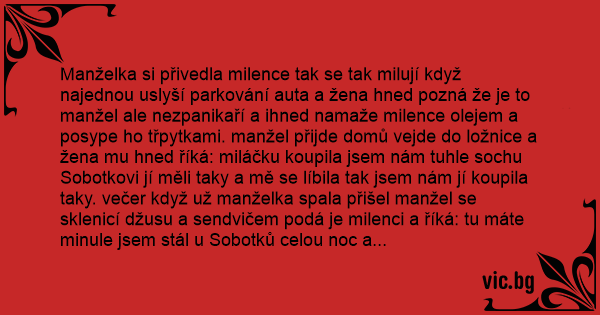 Manželka si přivedla milence tak se tak milují když najednou uslyší parkování auta a žena hned pozná že je to manžel ale nezpanikaří a ihned namaže milence olejem a posype hо třpytkami. manžel přijde domů vejde do ložnice a žena mu hned říká: miláčku koupila jsem nám tuhle sochu Sobotkovi jí měli taky a mě se líbila tak jsem nám jí koupila taky. večer když už manželka spala přišel manžel se sklenicí džusu a sendvičem podá je milenci a říká: tu máte minule jsem stál u Sobotků celou noc a nedali mi ani napít