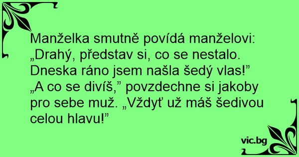 Manželka smutně povídá manželovi: „Drahý, představ si, co se nestalo. Dneska ráno jsem našla šedý vlas!”