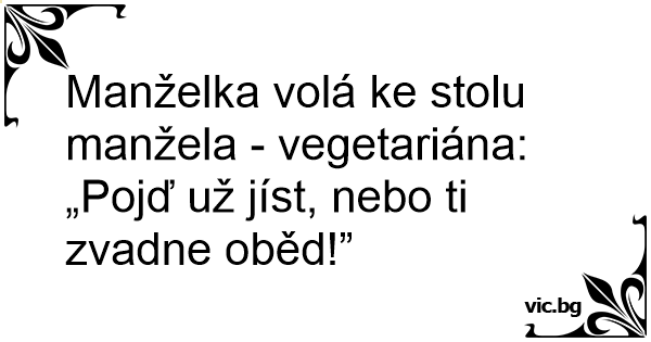Manželka volá ke stolu manžela - vegetariána: „Pojď už jíst, nebo ti zvadne oběd!”