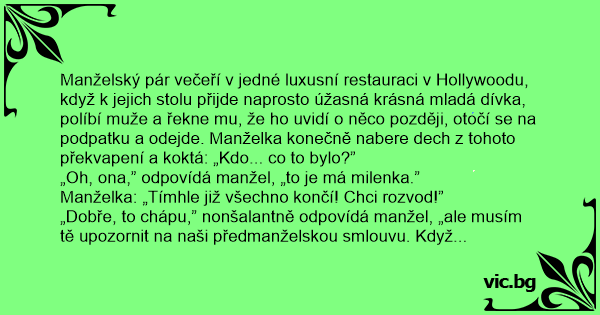 „Dobře, to chápu,” nonšalantně odpovídá manžel, „ale musím tě upozornit na naši předmanželskou smlouvu. Když se rozvedeš, no to pak nebudou žádné výlety do Dubaje, nákupy v Paříži, dovolená v Cancúnu, Porsche v garáži a žádné kapesné. Ale to je tvé rozhodnutí - jak chceš.”