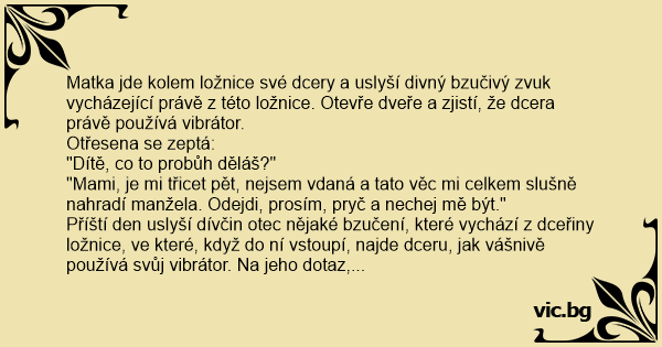 Matka jde kolem ložnice své dcery a uslyší divný bzučivý zvuk vycházející právě z této ložnice. Otevře dveře a zjistí, že dcera právě používá vibrátor.