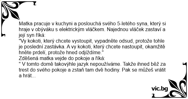 Matka pracuje v kuchyni a poslouchá svého 5-letého syna, který si hraje v obýváku s elektrickým vláčkem. Najednou vláček zastaví a její syn říká: