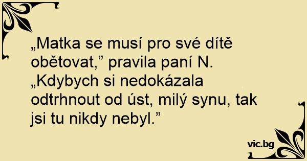 „Matka se musí pro své dítě obětovat,” pravila paní N. „Kdybych si nedokázala odtrhnout od úst, milý synu, tak jsi tu nikdy nebyl.”